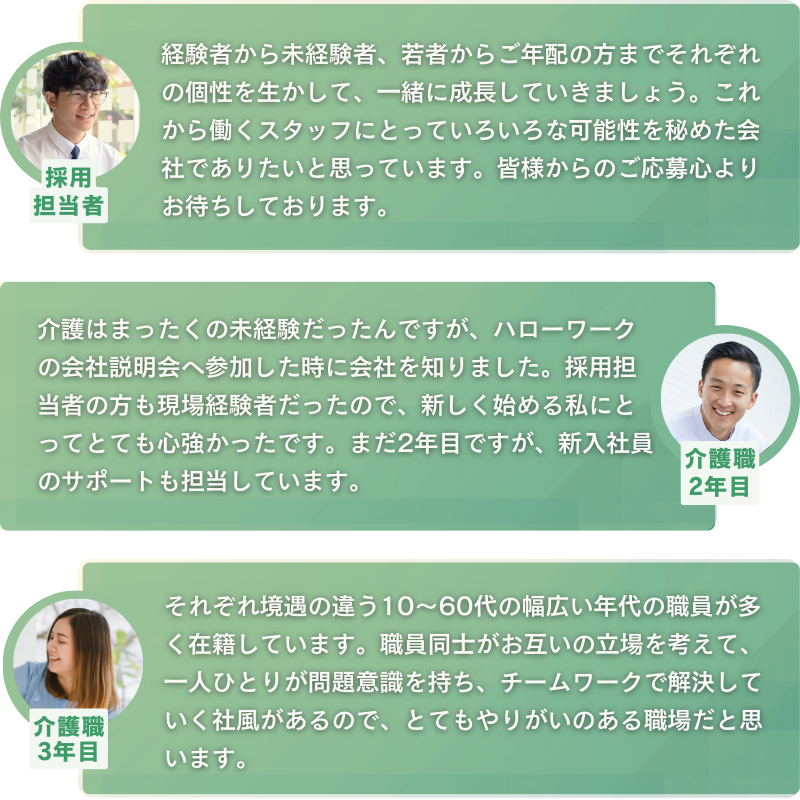 「昔からおばあちゃん子だったから高齢者の方が好き」「人の役に立つ仕事がしたい」「地元で働き続けたい」「子供の学費の足しに働くので家庭を優先したい」など様々な理由で働くスタッフがいます。